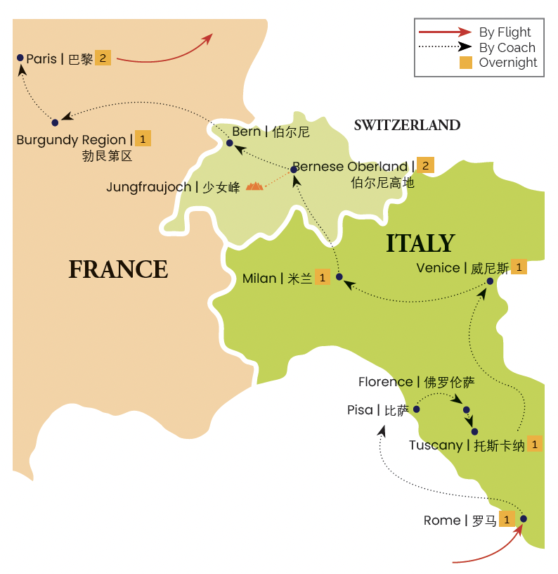 Experience the epitome of European charm with our exclusive tour package. From the breathtaking Eiger Express to Jungfraujoch, Michelin Star dining at the Eiffel Tower, to a Seine River gourmet cruise and captivating city tours of Rome and Paris - indulge in the essence of Italy, Switzerland, and France.