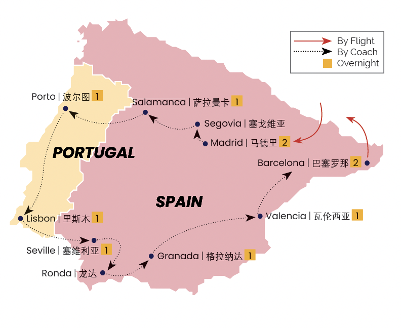 Discover the highlights of Spain and Portugal, exploring iconic cities and UNESCO World Heritage Sites from Madrid, Segovia, Seville, Granada, and Barcelona to Lisbon, Porto, and Toledo. Enjoy signature experiences including a Jamón Ibérico factory visit, paella cooking workshop, Sagrada Familia entrance, Gaudí’s masterpieces, and breathtaking landmarks like Belém Tower and the Alhambra viewpoints.
